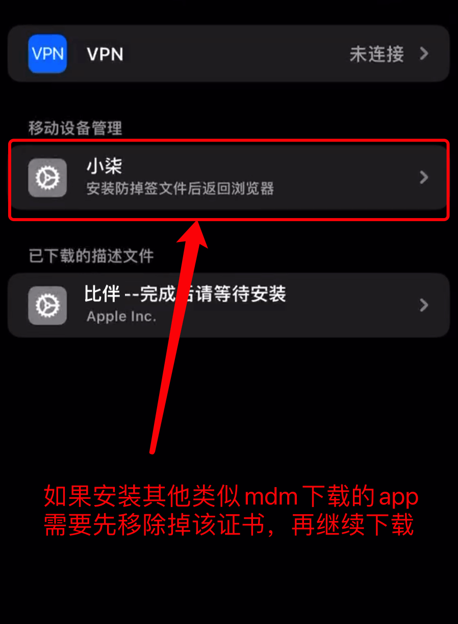 在设置-通用-设备管理-移动设备管理-移除管理,如果移除了还是提示同样的错误,需要检查是否有安装同类型的应用,如果有则也需要移除一下